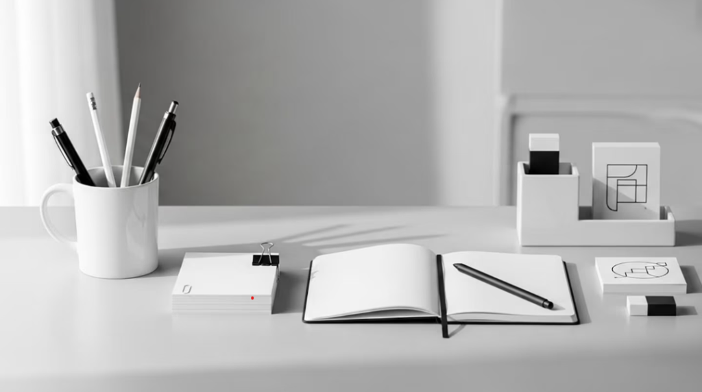 Una scrivania efficace non richiede necessariamente molti accessori. Spesso bastano pochi elementi essenziali: un computer, un’area libera per scrivere e alcuni strumenti facilmente accessibili.